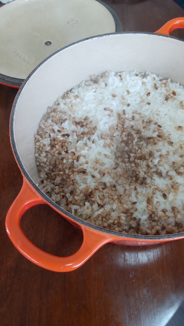 今日のご飯には玄米茶で使う煎り玄米入りです。