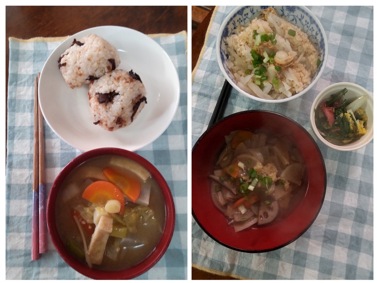 旦那が風邪引いた ここ2〜3日で急に冷え込んでこの寒さじゃ風邪のひとつやふたつ簡単に引きそうだと思ってた矢先、旦那が風邪をもらってきました。そんな日はあったかごはんで養生します。朝ごはんは里芋と根菜のお味噌汁きくらげの佃煮を混ぜ混んだおにぎり夕ごはんのっぺい汁帆立と大根の炊き込み御飯白菜と春菊の梅おかか和えのっぺい汁も帆立ごはんも冬は鬼リピするメニュー。葛粉や生姜が入って体がぽかぽかに暖まります🥰