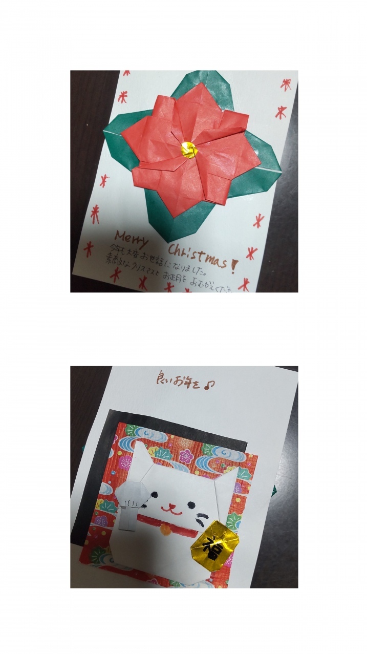 年賀状じまい 年賀状…出していますか?我が家は今年で年賀状終いをします。古くからのものが失くなることに寂しさを感じつつ、今年はこんなカードを作って親しい人に送ることにしました。表はポインセチアを飾ったクリスマスカード裏を返すとおめでたい招き猫で年賀状風です☺️カミキイさんの折り紙の本を参考に作ってみました。