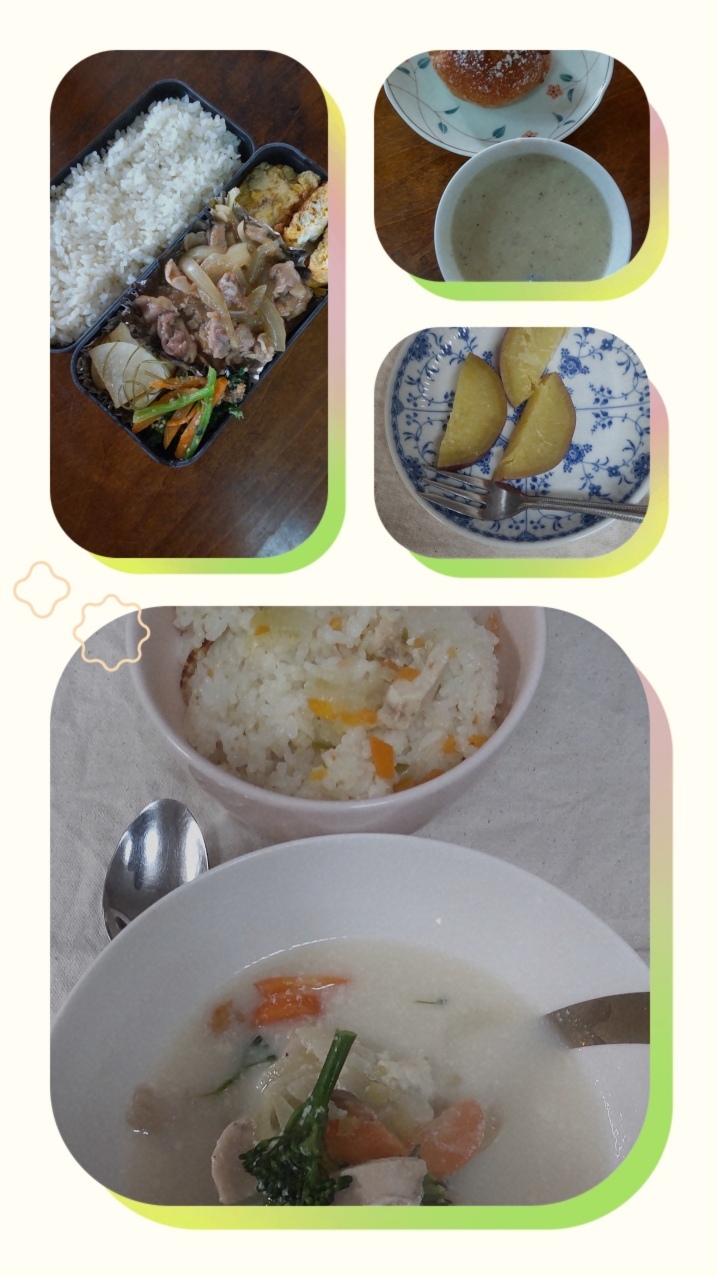 さつまいもばっかり食べてる日 朝ごはんさつまいもポタージュとくるみパンお弁当豚すき煮メインごま和えと大根の甘酢漬けおやつ蒸しさつまいも夕ごはんほたてとチキンのピラフさつまいもときのこ、チキンのミルクスープ季節もののばっかり食べあるある🤭