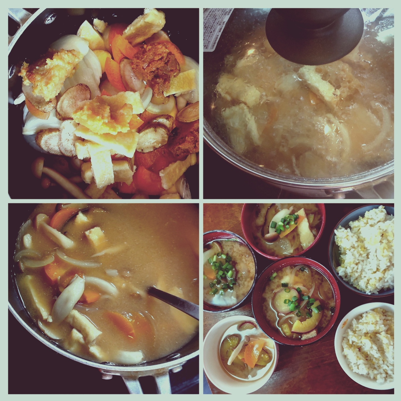 朝の定番重ね煮味噌汁💗 朝は具沢山のお味噌汁とごはんが定番。デトックスを促します。重ね煮味噌汁は具材をきのこ、こんにゃく→葉野菜→イモ類→根菜→たんぱく質と 順に重ね、最後に味噌も。出汁なし、あく抜きなしでめっちゃお手軽です。あとは蓋して火にかけてほっとくだけ✨