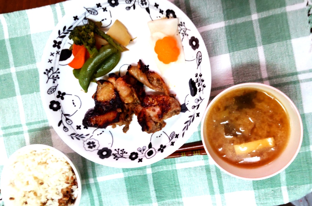 3月6日夕ごはん 食卓が徐々に春めいてきました🌸今日はふきみそチキン春野菜蒸し煮かぶの甘酢づけわかめと大根の味噌汁ふきみそは昨日作りました。ふきの苦味はデトックスを促し怠さや花粉症の症状を緩和してくれます。独特の苦味は、苦手な方も多いと思いますが、ふきみそチキンは子どもでも食べやすくおすすめです😊ふきみそにみりんをまぜてタレを作り、そこに鶏もも肉を一晩浸けておきます。オーブンやフライパンで焼けば完成です!