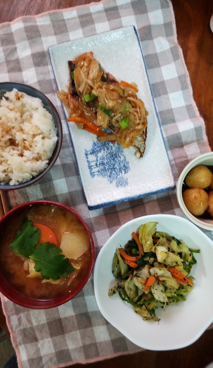 3月11日 夕ごはんの記録 今日は鰆の生姜風味あんかけせりの黒ごま和え春の重ね煮味噌汁デザートにみたらし団子スーパーで限界を迎えそうなおつかいもののせりを救出しました🤭独特なえぐみも、甘味のあるキャベツやにんじんといっしょに蒸し煮すると食べやすくなります。お味噌汁の薬味に三つ葉を添えて緑鮮やか春の献立です