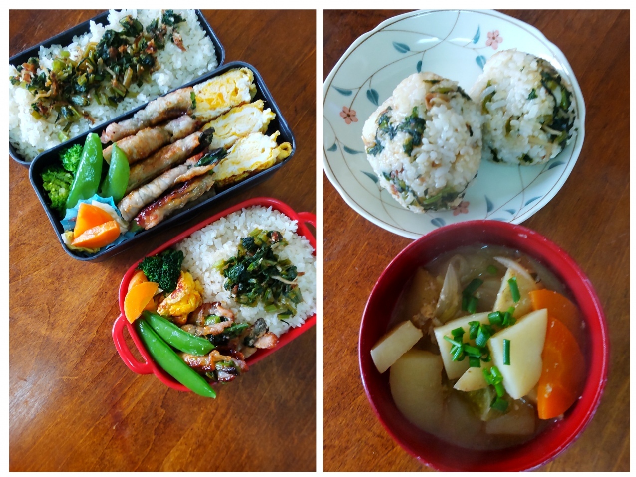 今日の朝ごはんとお弁当 前記事うまくいかないので書き直しました。今日の朝ごはんかぶの葉っぱおにぎりとちりめんじゃこ入りのお味噌汁♪お弁当はのらぼう菜の肉巻きです。菜の花系の苦味はのらぼう菜<かき菜<菜の花…かな?さて、今日は1日お休み\(^_^)/1日台所にこもる予定( *´艸`)